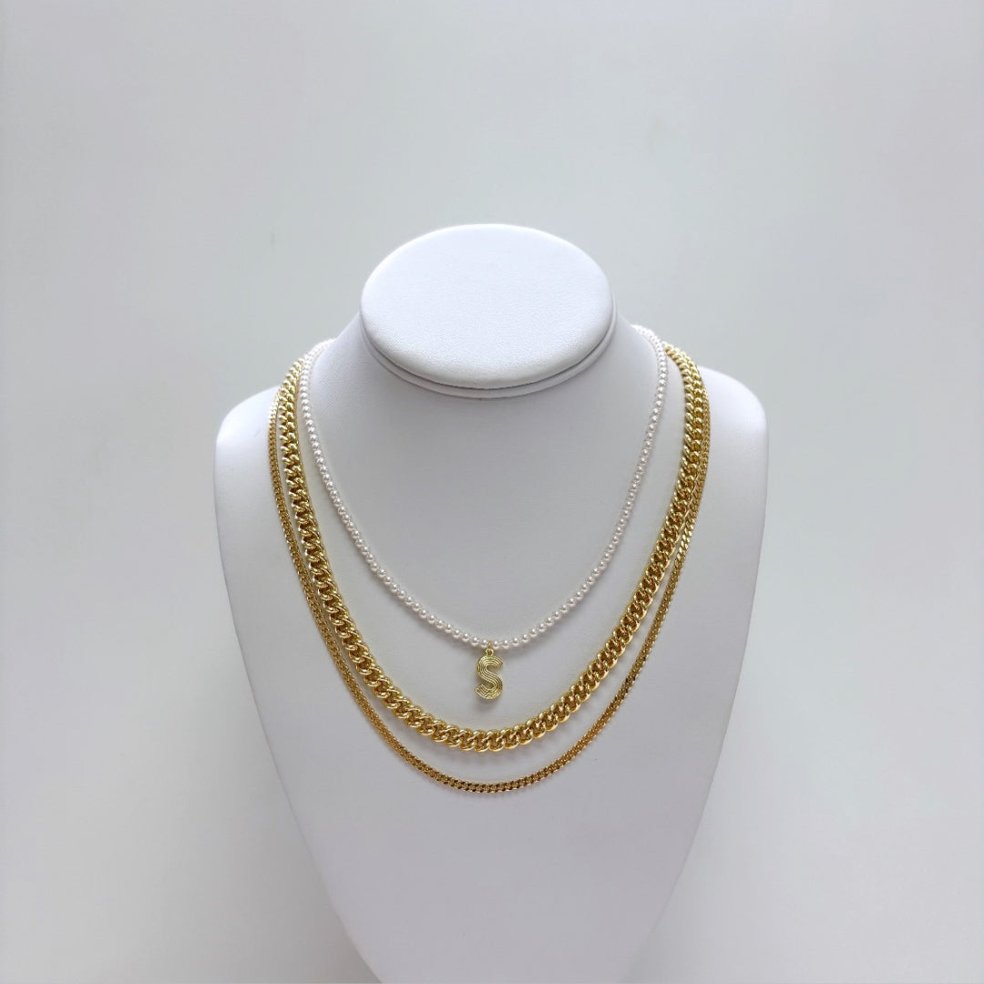 - Third Layer: thinner Cuban link style chain