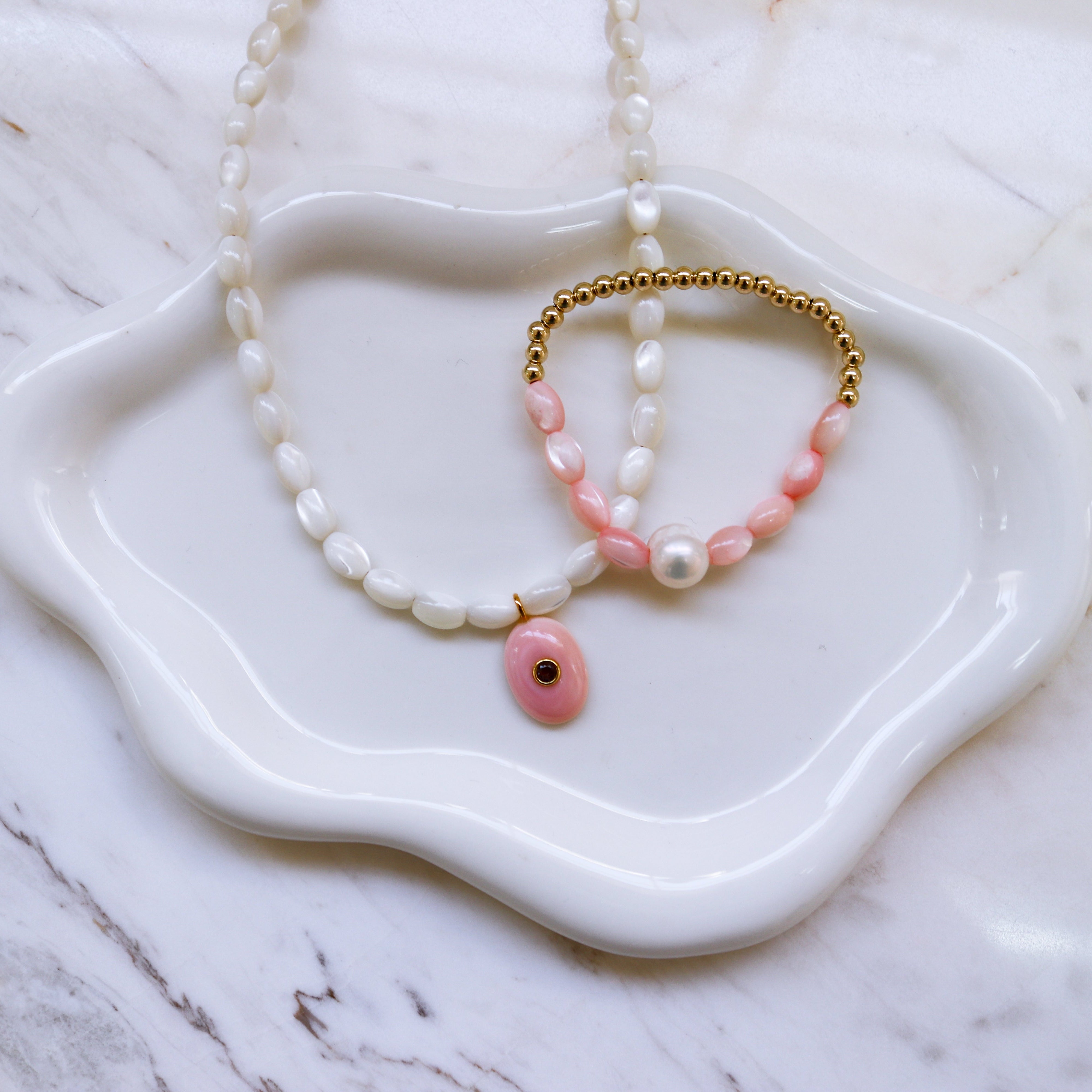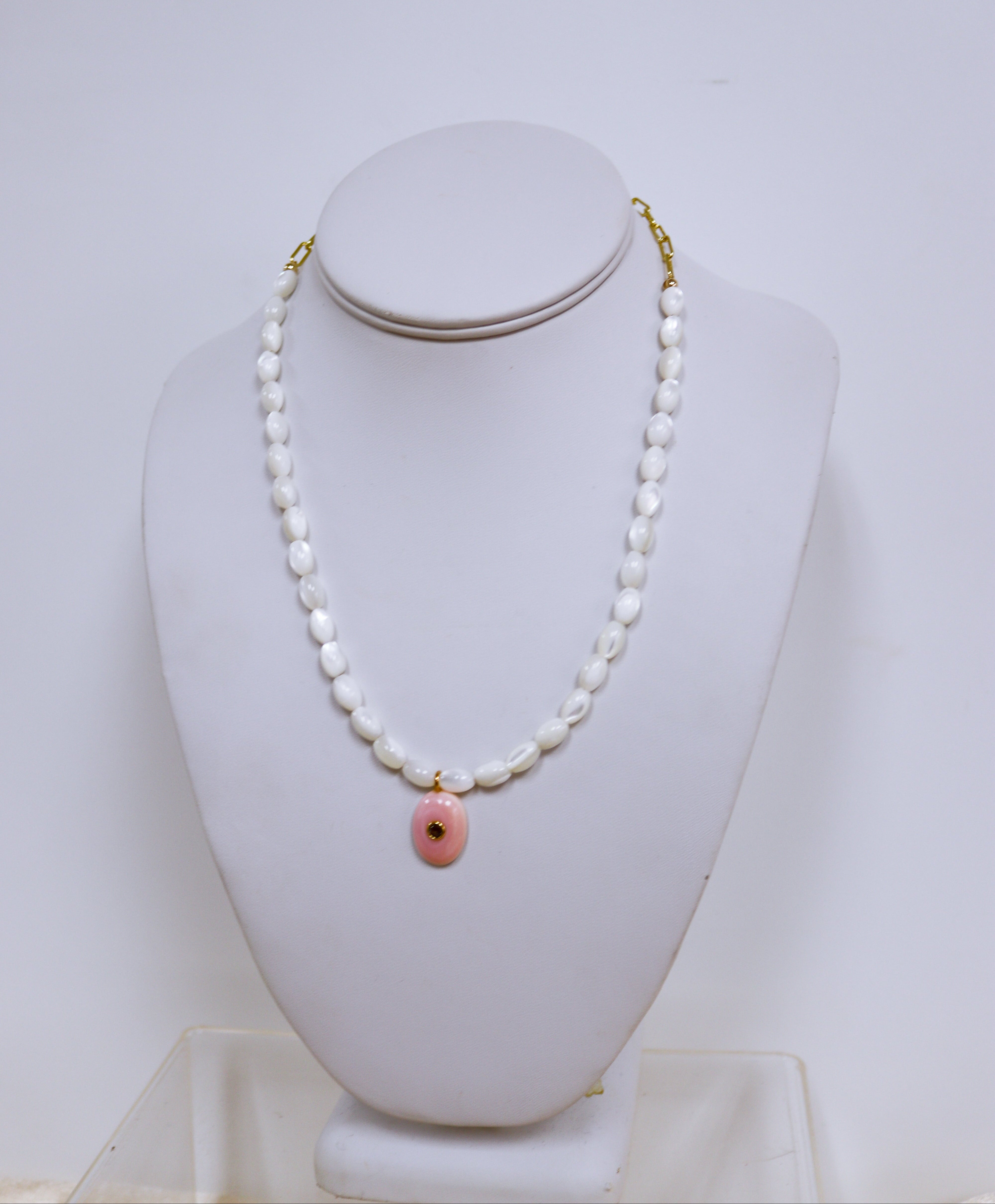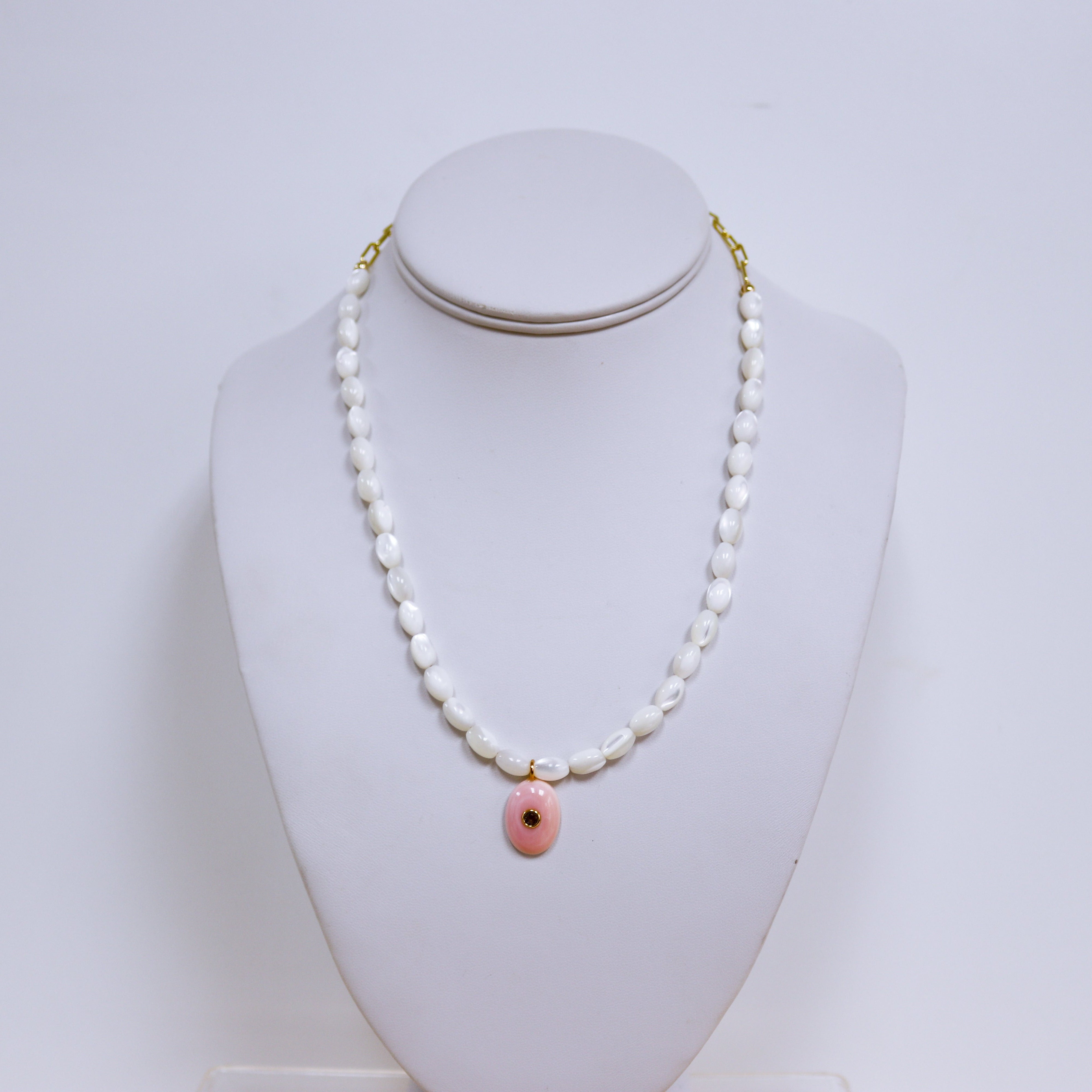 • Accented with a blush pendant
