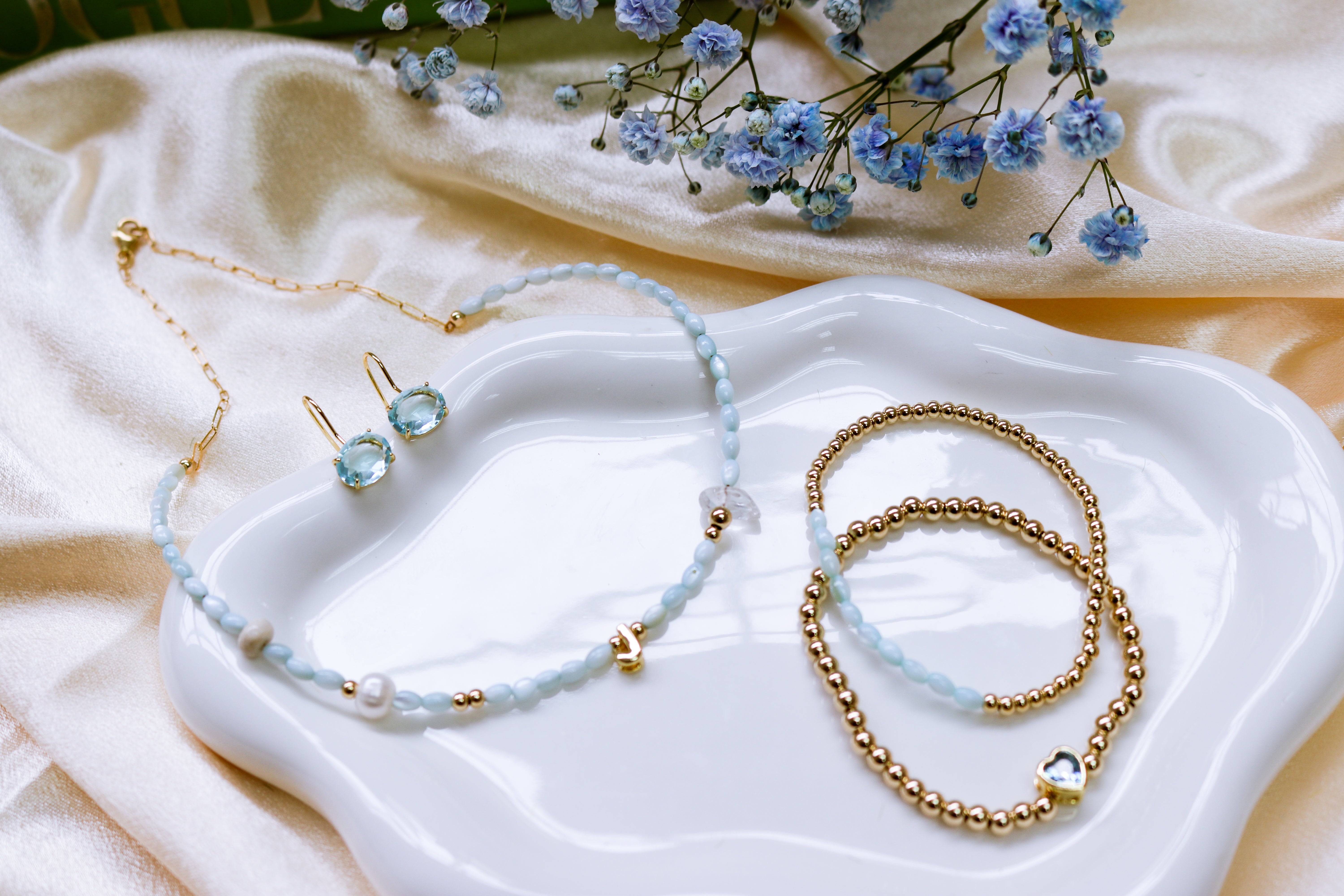 • Featuring a mix of light blue beads, gold-filled beads and a pearl