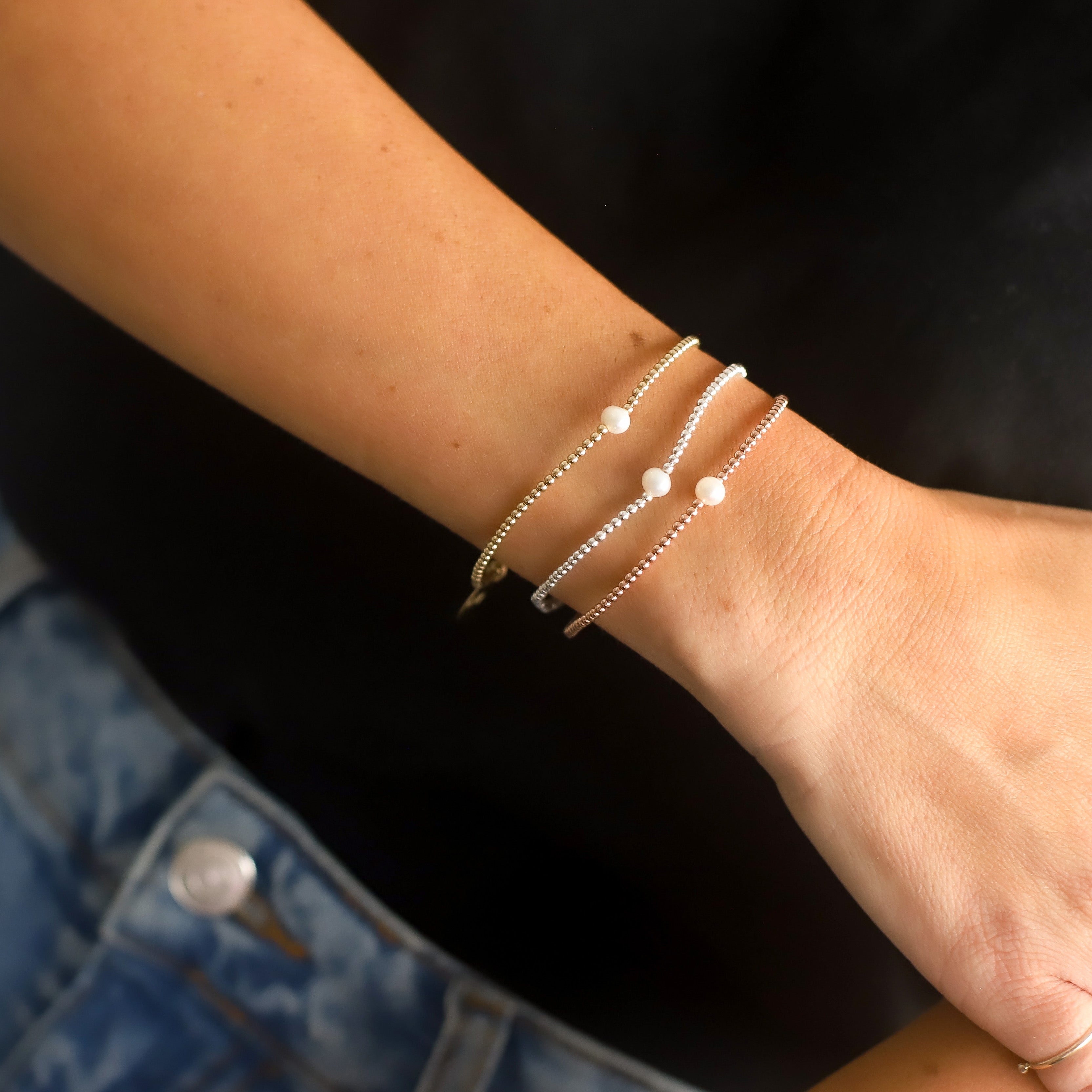 • Featuring one rose gold, one yellow gold and one silver beaded stretch bracelet with a dainty pearl