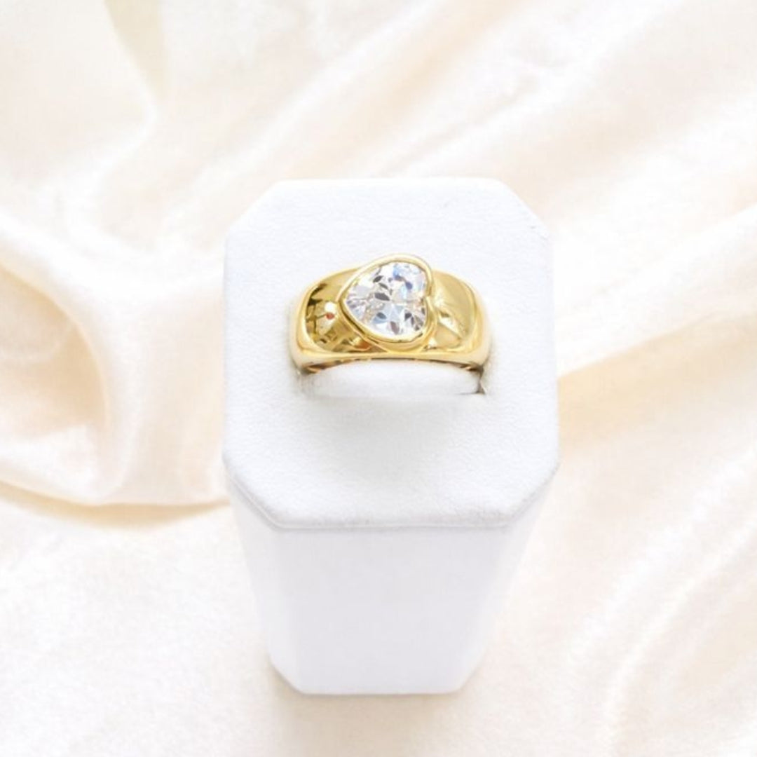 - Featuring a think gold band and crystal heart